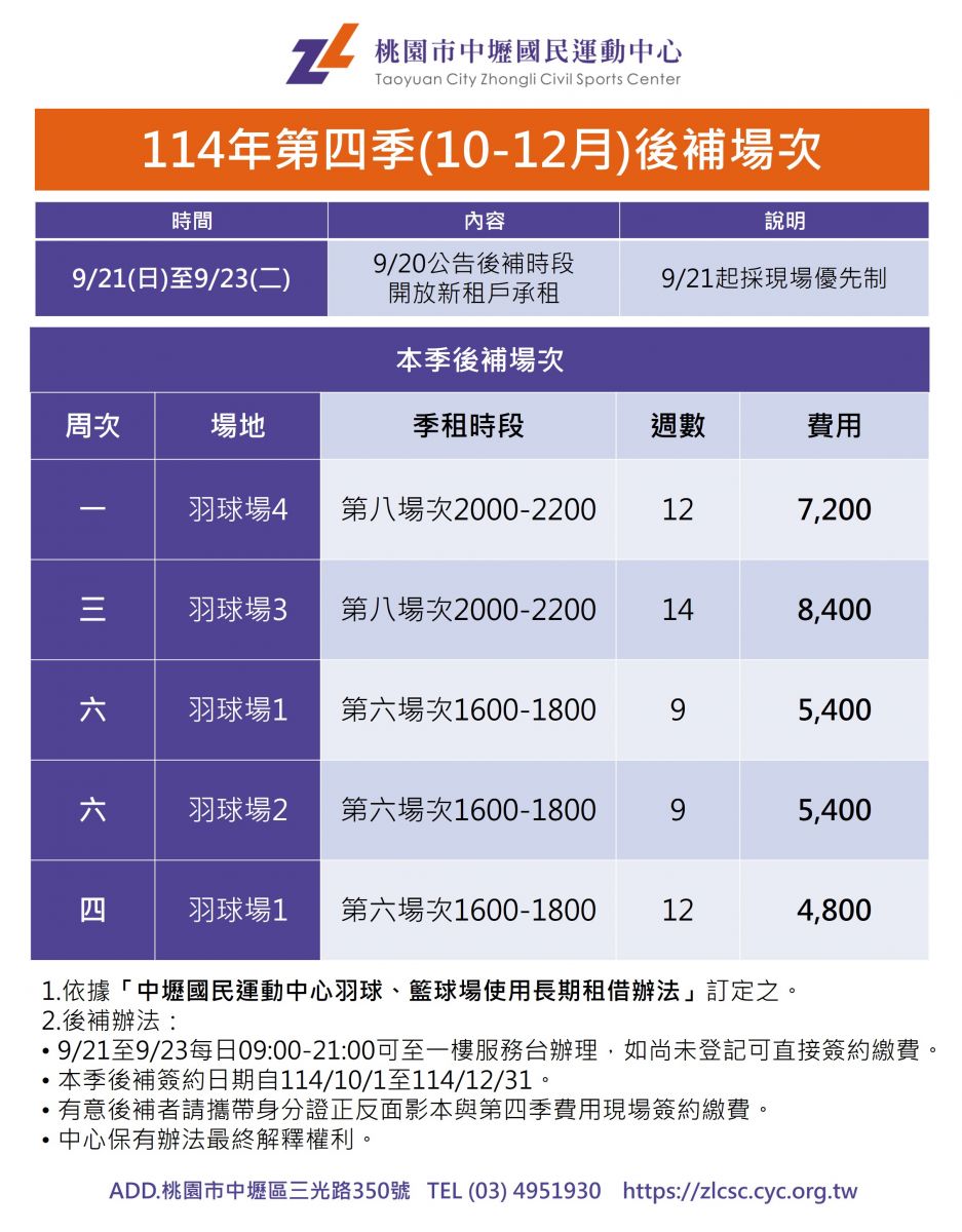 114年中壢國民運動國民運動中心季租後補簽約名單12/11更新