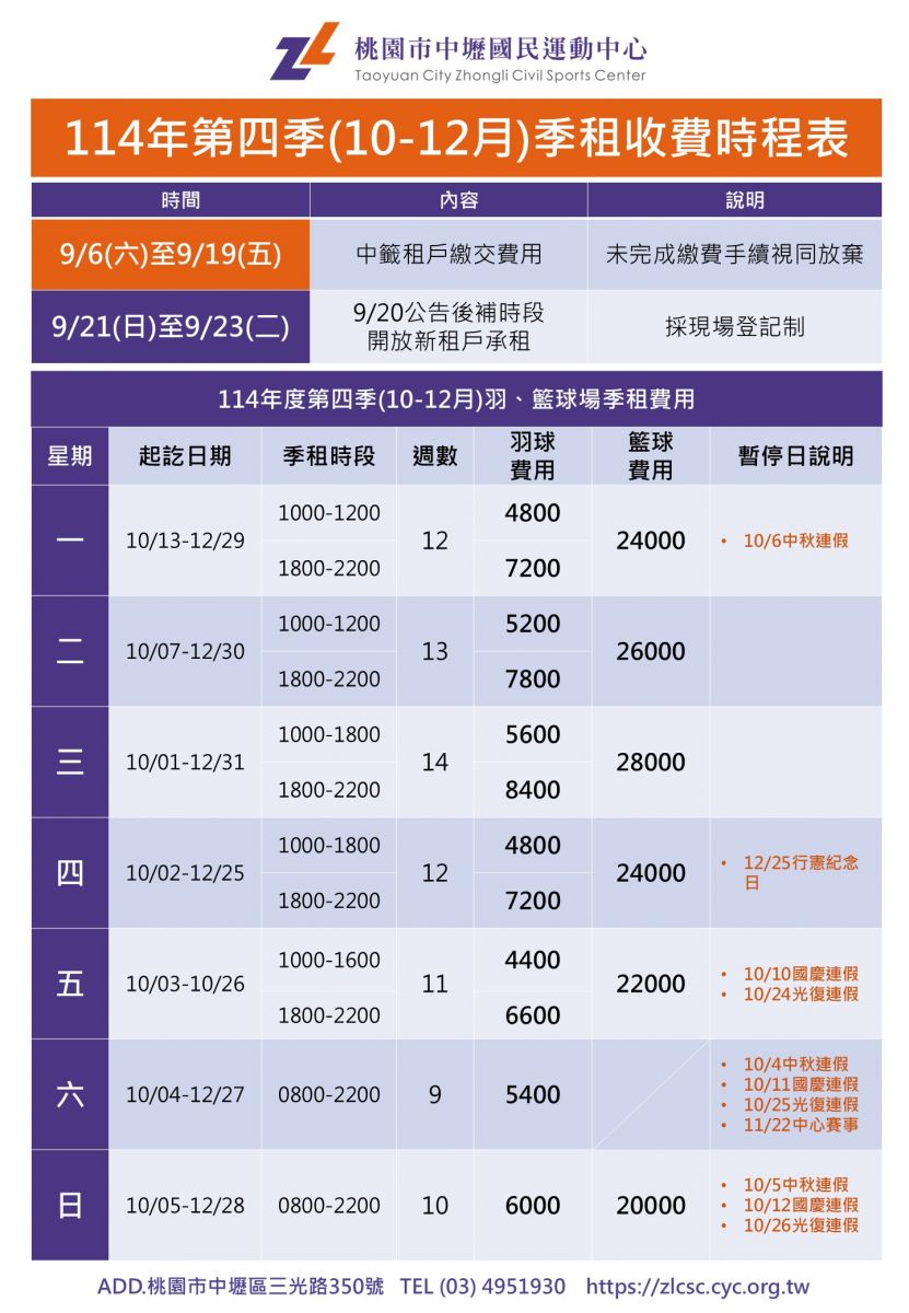 (三)籃球場僅提供平日時段季租。